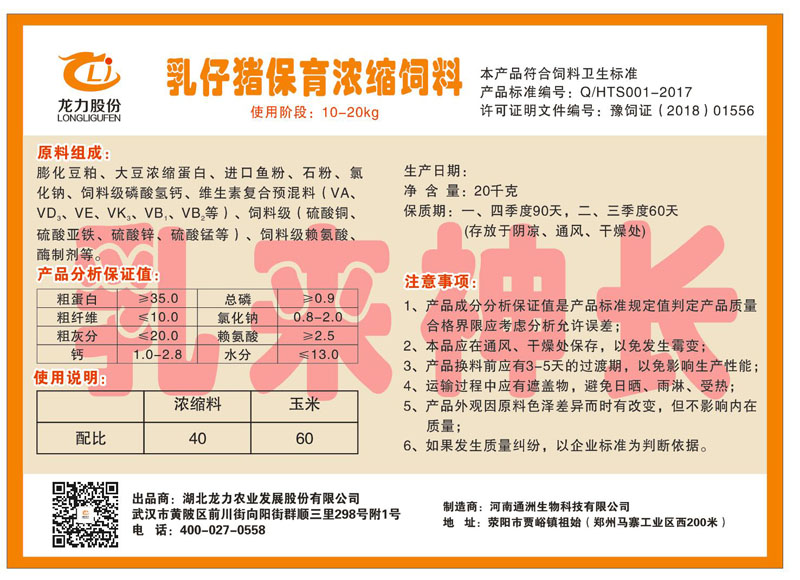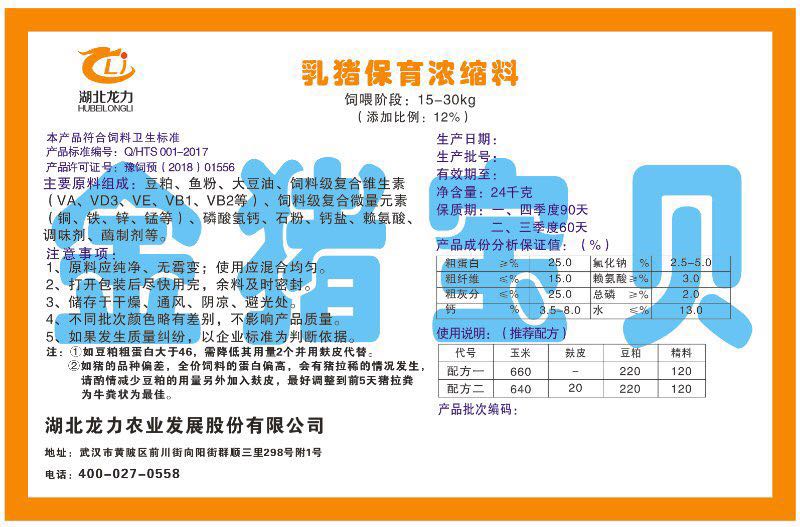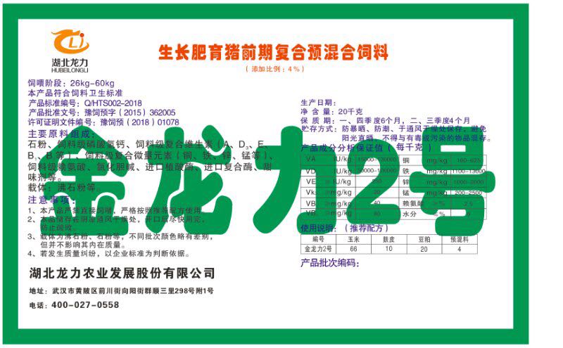 湖北龍力農(nóng)業(yè)發(fā)展股份有限公司坐落于武漢市黃陂區(qū)前川街向陽街群順三里298號附1號。公司成立于2014年6月,公司自成立以來把“創(chuàng)全球最大養(yǎng)豬綜合服務(wù)”為企業(yè)愿景。致力于打造教保料品牌”作為公司發(fā)展的明確目標。公司一直致力于豬營養(yǎng)的研究和開發(fā),積極與國內(nèi)外高校和科研機構(gòu)合作,推廣養(yǎng)豬技術(shù)、動物營養(yǎng)新概念,向世界農(nóng)牧企業(yè)學(xué)習(xí)與合作。公司采用國內(nèi)先進的生產(chǎn)工藝,選擇高精度電子配料秤,高均勻度、無殘留混合機等先進設(shè)備....